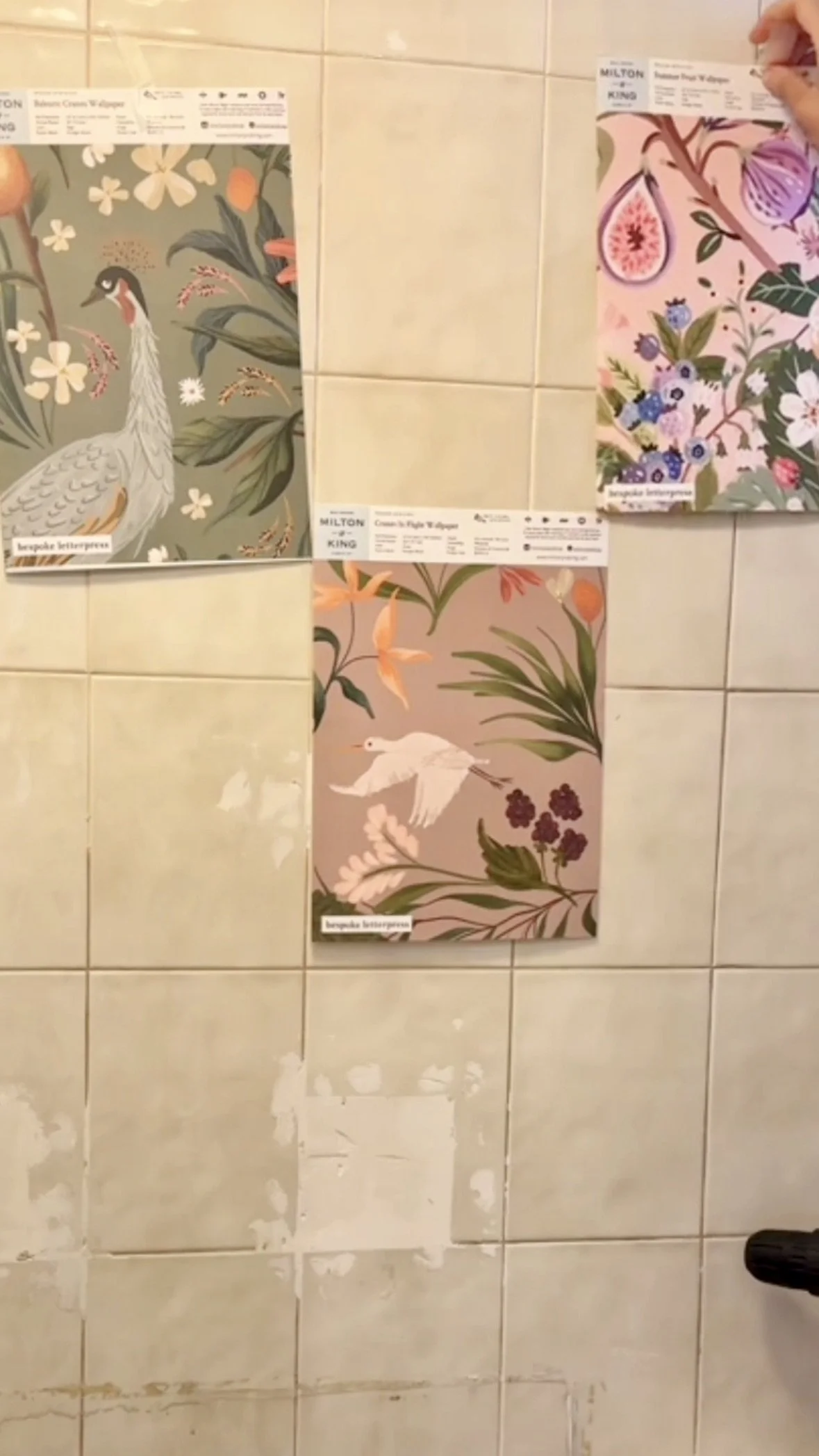 I set out to transform the space without a costly, unnecessary demolition. Inspired by our intention, I curated a mood board to guide our design choices. I opted to preserve the tiles and enhance them with Milton & King's Cranes in Flights woven wallpaper for a touch of elegance, this wallpaper was heavy but and such a pleasure to work with.