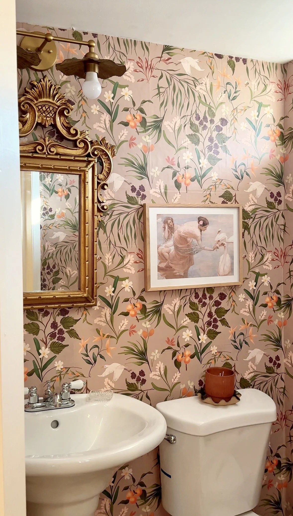 With the technical hurdles overcome, I turned our attention to the details. Thrifted treasures, like a stunning ornate gold leaf mirror and a vintage brass bow hook, added personality to the space, tying together my vintage-inspired design.