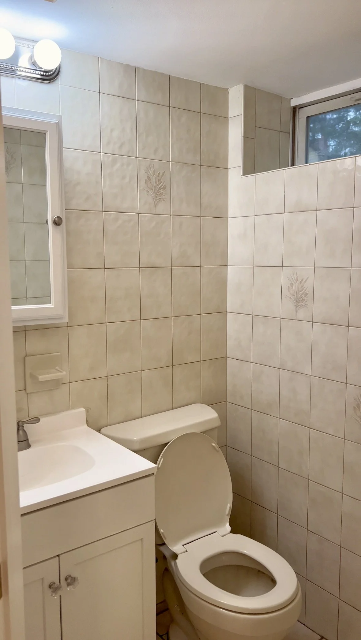 Without hesitation, we removed the moldy vanity and the dated 1990s toilet. To our relief, the bathroom tiles were surprisingly resilient, begging for a makeover. With sustainability and cost in mind, we decided to work with what we had instead of starting from scratch.
